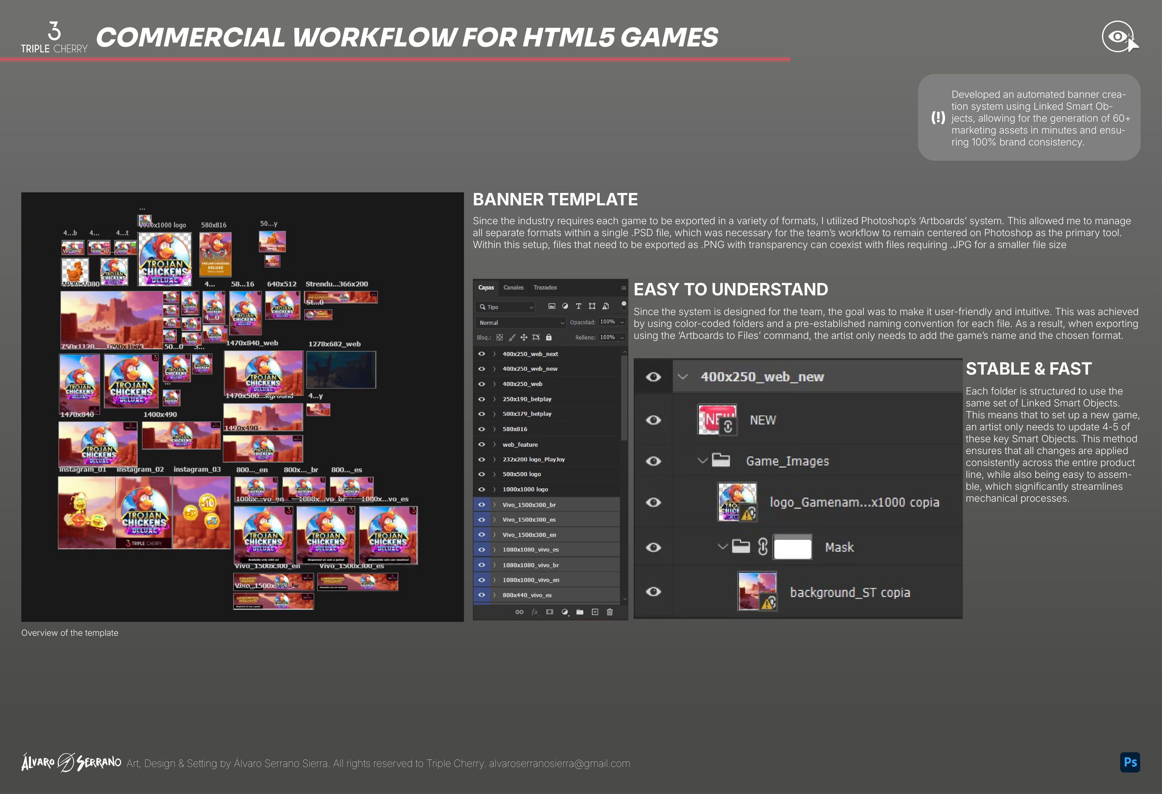 This workflow demonstrates how I extended my pipeline philosophy beyond in-game assets to include the automated production of marketing materials. The goal was to create a system that could generate dozens of banner sizes for commercial campaigns quickly and with perfect brand consistency.