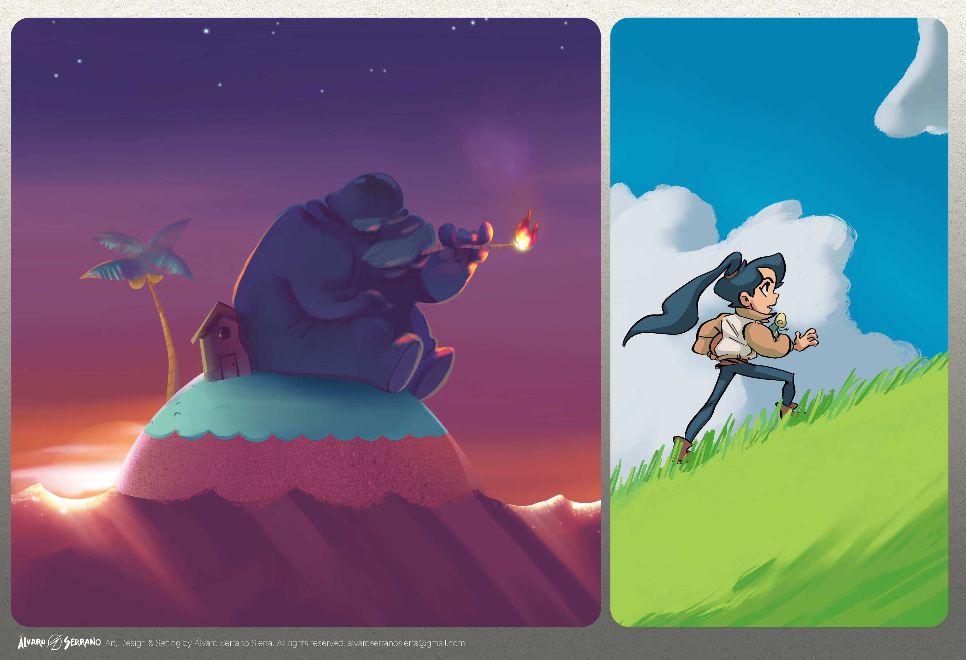 A contrasting pair of illustrations exploring two fundamental aspects of adventure: the quiet, introspective moments of solitude and the boundless energy of forward momentum. This set showcases versatility in mood-setting, ranging from atmospheric, painterly scenes to clean, dynamic character art.
